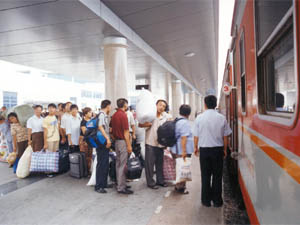 2003年大灾过后,寿西湖农场积极采取“劳务救 灾”措施,组织职工外出打工,增加灾后收入。8月 11日下午,首批68名职工从合肥火车站愉快地踏上 了 蚌埠开往广州的1403号列车,前往广州永华胶合板 厂打工。(鲍广云)