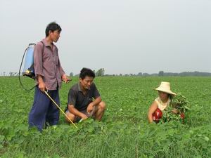 图片说明:潘村湖农场广大职工家庭农场抓住当前 有利时机积极开展大豆田间管理工作,力争夺取秋 季丰产丰收。图为分场农技人员在田间指导职工做 好化除工作。(杨登宏摄)