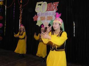 为庆祝建场50周年,潘村湖农场于12月9日举办了大 型职工文艺汇演活动。来自场属各单位的100余名文 艺爱好者为全场职工群众奉献了25个精彩的歌舞节 目。图为由种子公司选送的舞蹈《新疆好》。(杨 登宏摄)